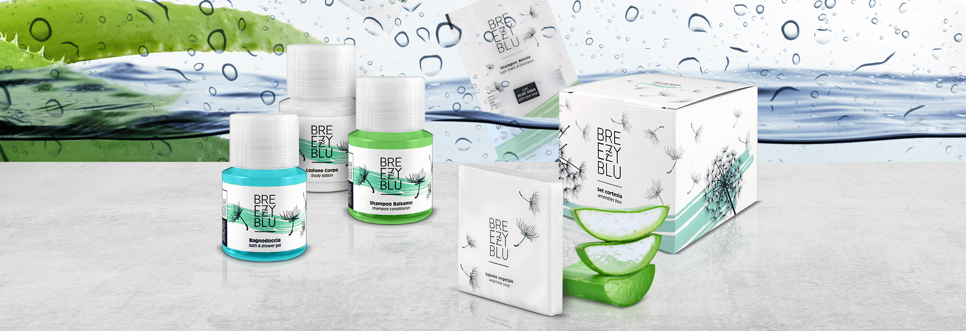 The Breezy Blue guest amenities are an explosion of freshness. They include hydrating products that nurture and soothe dehydrated and irritated skin. As a matter of fact, this cosmetic formulation is enriched with natural aloe vera extracts that by nature do not irritate the skin and are well tolerated by all skin types. Moreover, aloe vera boosts collagen production and gives fantastic anti-ageing benefits.