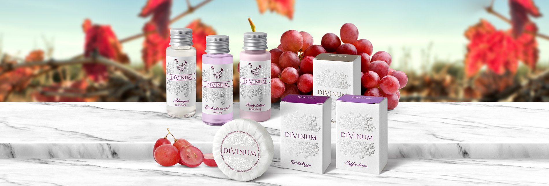 Grape is an ancient fruit providing several benefits to the body, the skin and the hair, because it acts on microcirculation. Each part of the grape tackles skin ageing thanks to the hydrating effect of the glucose and the fructose and thanks to the polyunsaturated fatty acids that gently nourish even the most delicate skin. That is why we have created hotel toiletries without aggressive preservatives, such as products with an astringent, revitalizing and anti-ageing effect, designed to be tolerated by all skin types.